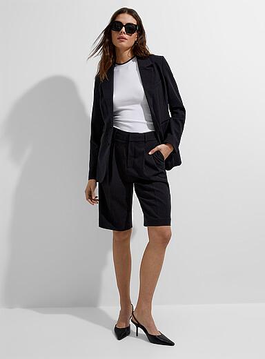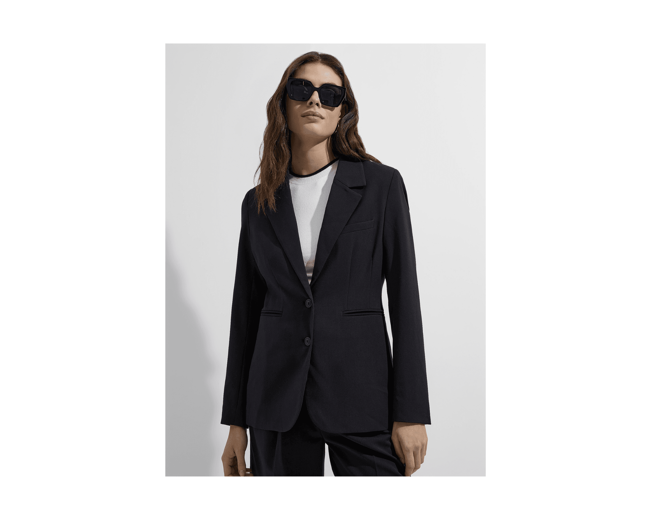Icône - Oversized two-button touch of wool blazer Icône Icône by Simons: an exclusive designed in Canada Fine, soft, and slightly stretch twill Made with polyester from recycled plastic bottles Touch of wool Built-in fine silky lining Loose style, slightly fitted at the waist Notch collar Built-in shoulder pads Small trompe-l'oeil chest pocket Piped pockets Simple two-button closure The size of the item pictured is small