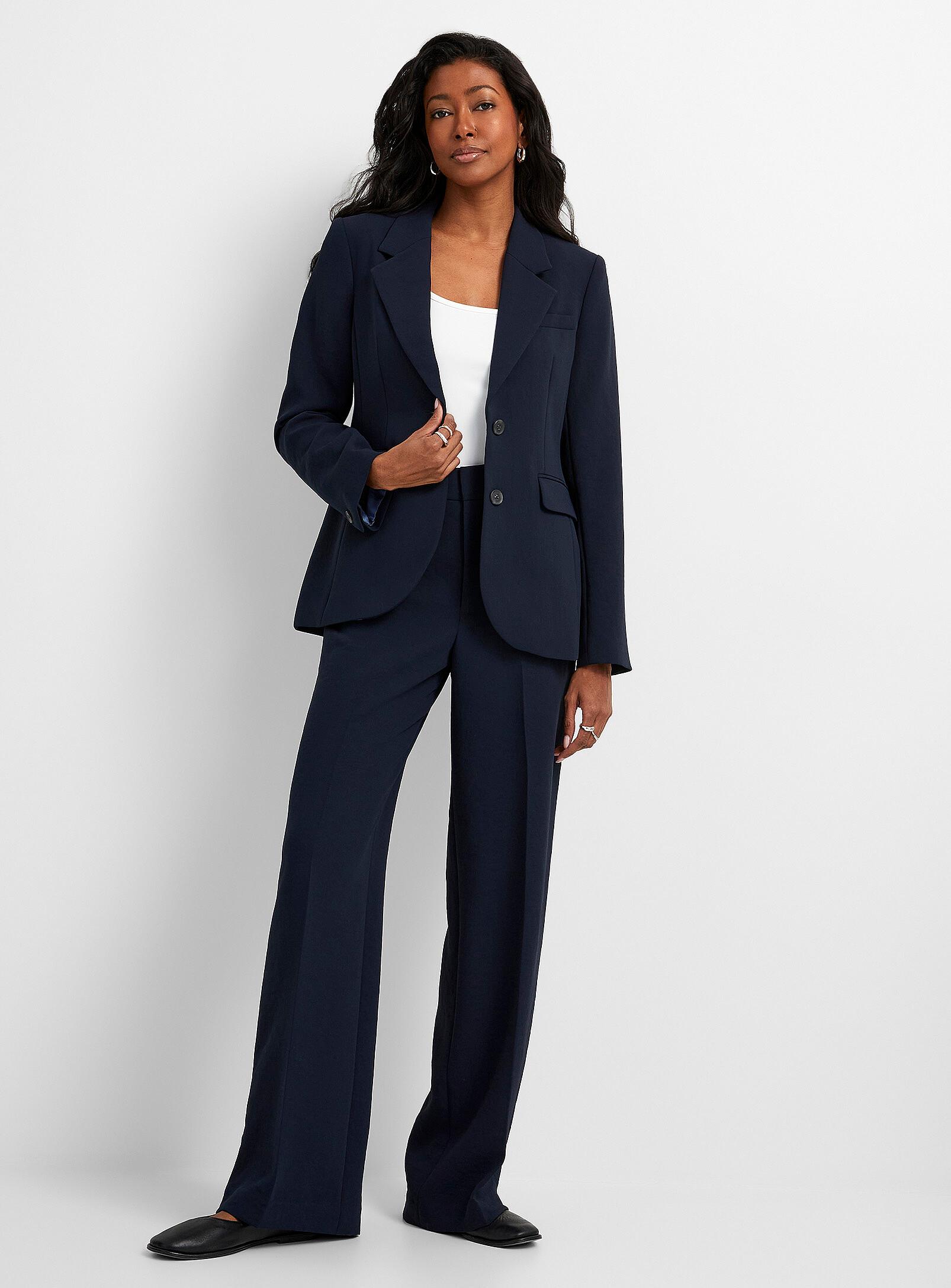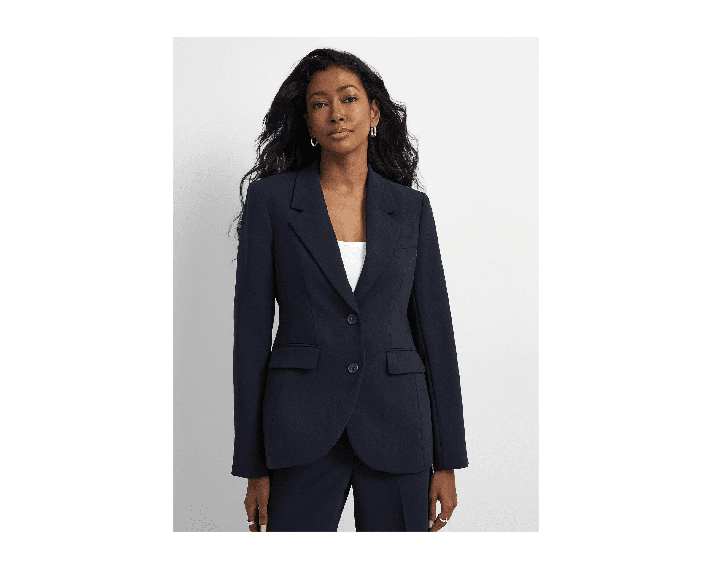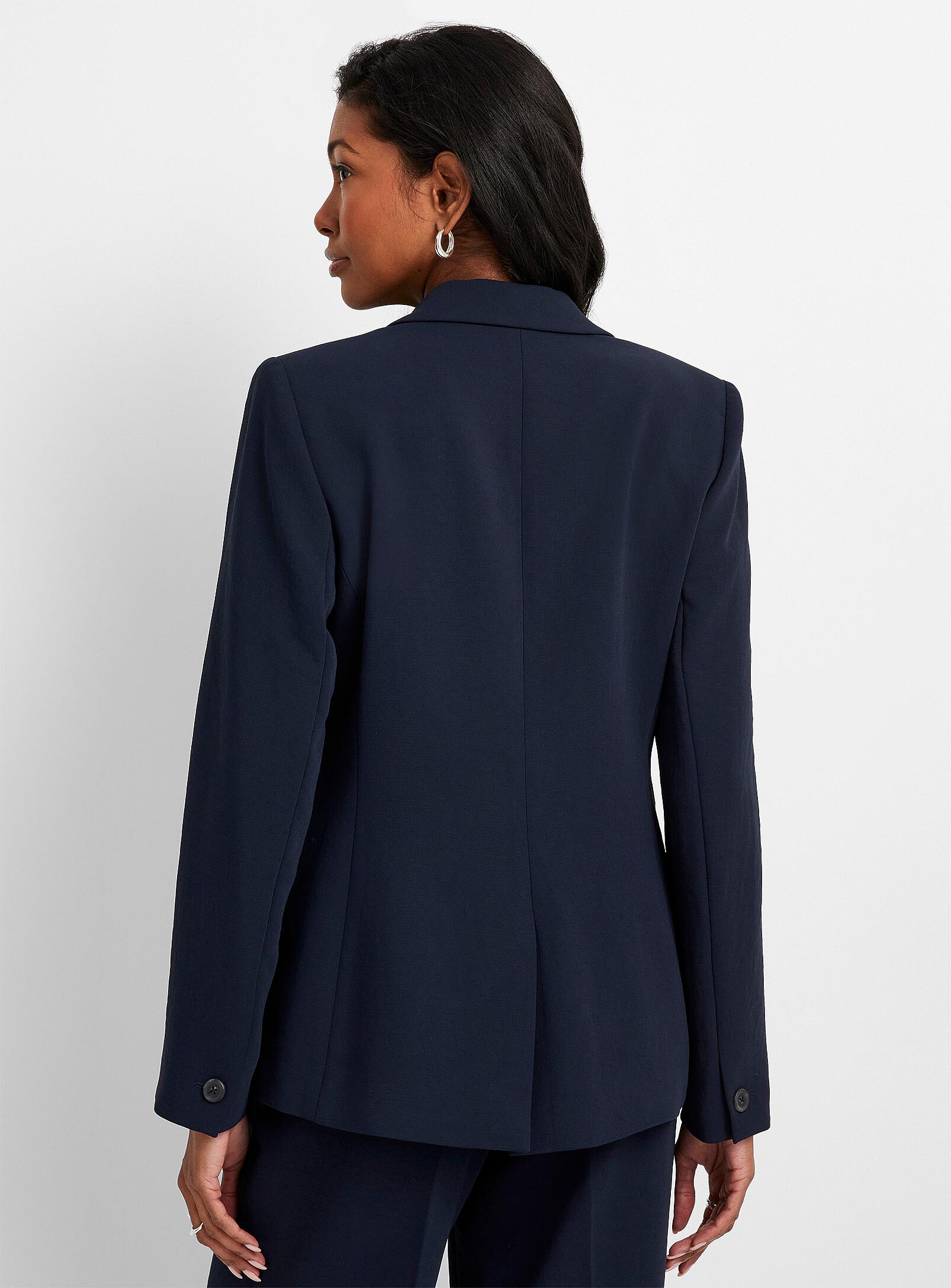 Stretch polyester crepe made from recycled plastic bottles, fine satiny lining. Regular fit. Simple closure with two marbled buttons. Flap pockets and slit pocket at the chest. Notch collar. Built-in shoulder pads.