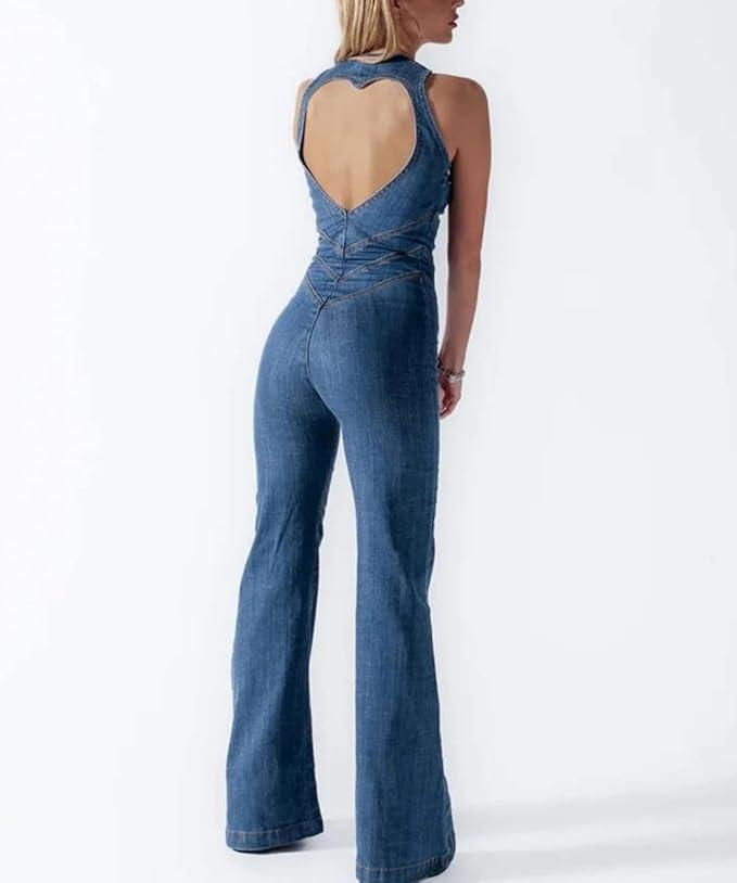 Women's denim jumpsuit open back suspender wide leg denim trousers. Soft denim fabric, 90% cotton + 10% polyester, soft and comfortable. High waist, open back sleeveless, zip fastening, classic overalls, slim fit wide leg pants, straight wide leg jeans for women.