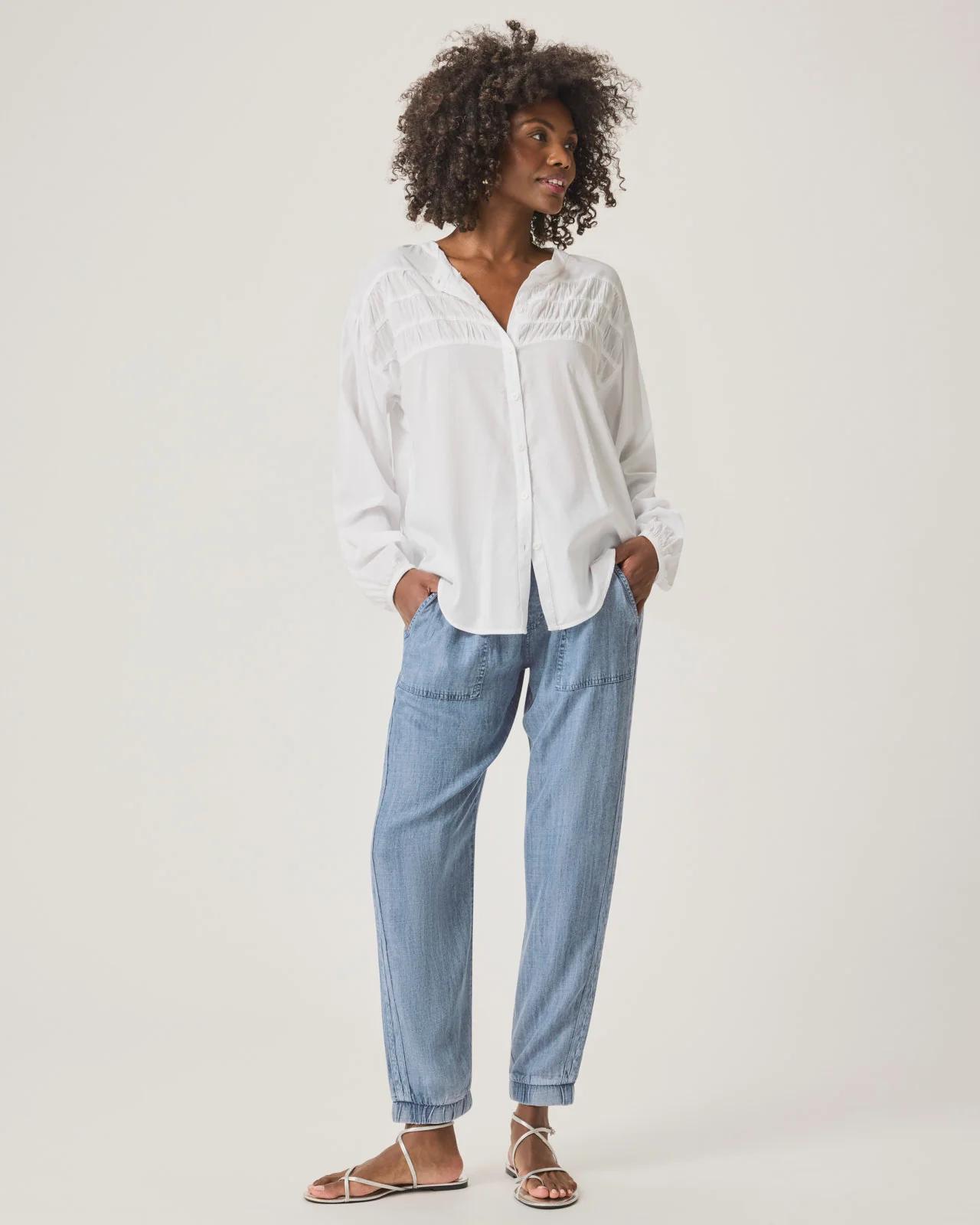 A jogger for just about every occasion. Made with chambray lyocell to create soft and lightweight feel that lets you breeze through your day. A comfy waistband and ankle cuffs lend no-shift security, while side trim elevates these everyday bottoms. 100% Lyocell Side trim Tapered ankles Drawstring waist Pockets