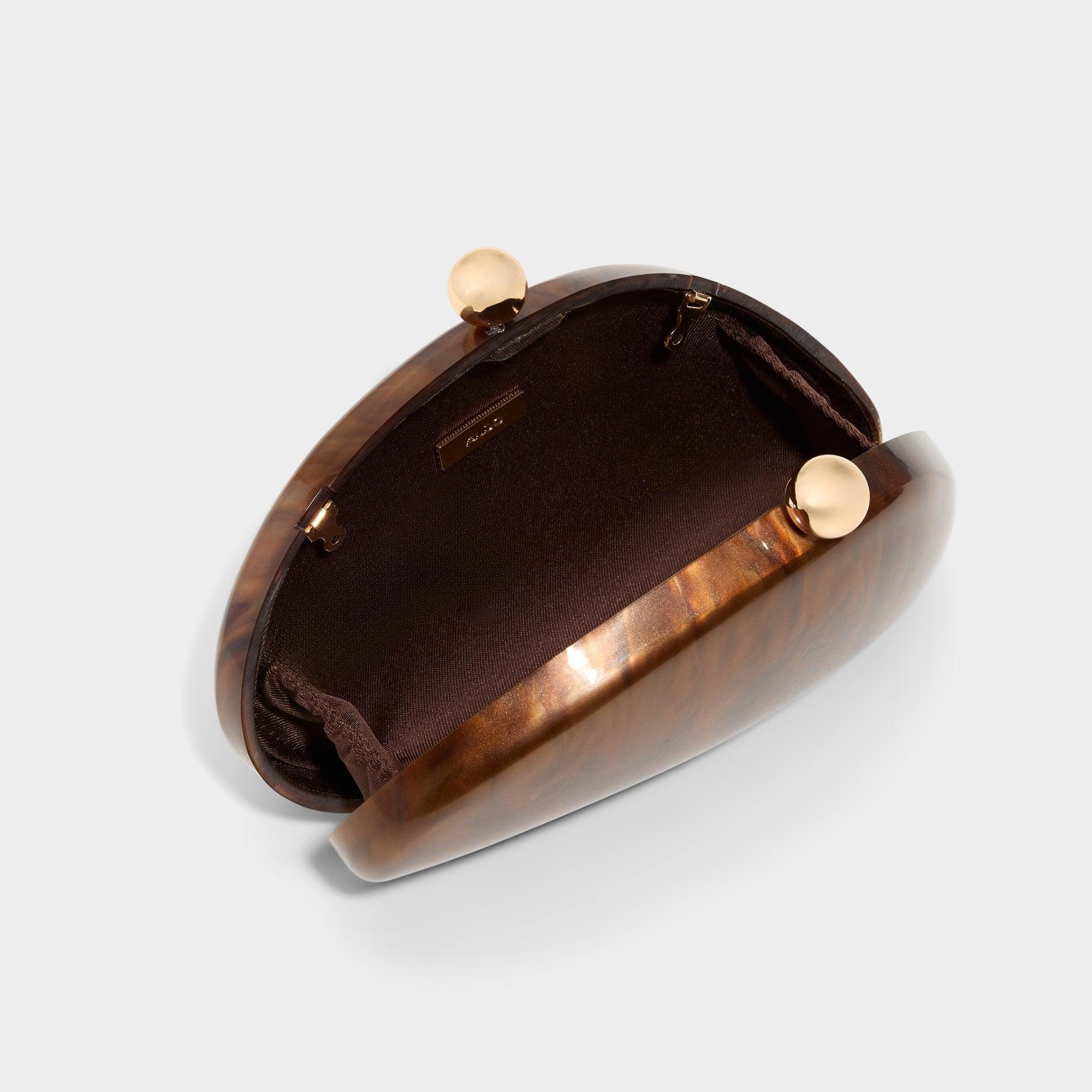 High-gloss marbled acrylic sculpts this pebble-slick clutch into a tiny work of art, crowned by gleaming orb-kiss lock hardware that snaps shut with satisfying certainty, keeping cards, keys, and lip tint quietly in place. Clutch it at gallery openings with a slip dress or tuck it under a blazer for late-night jazz, letting molten swirls finish the vibe.