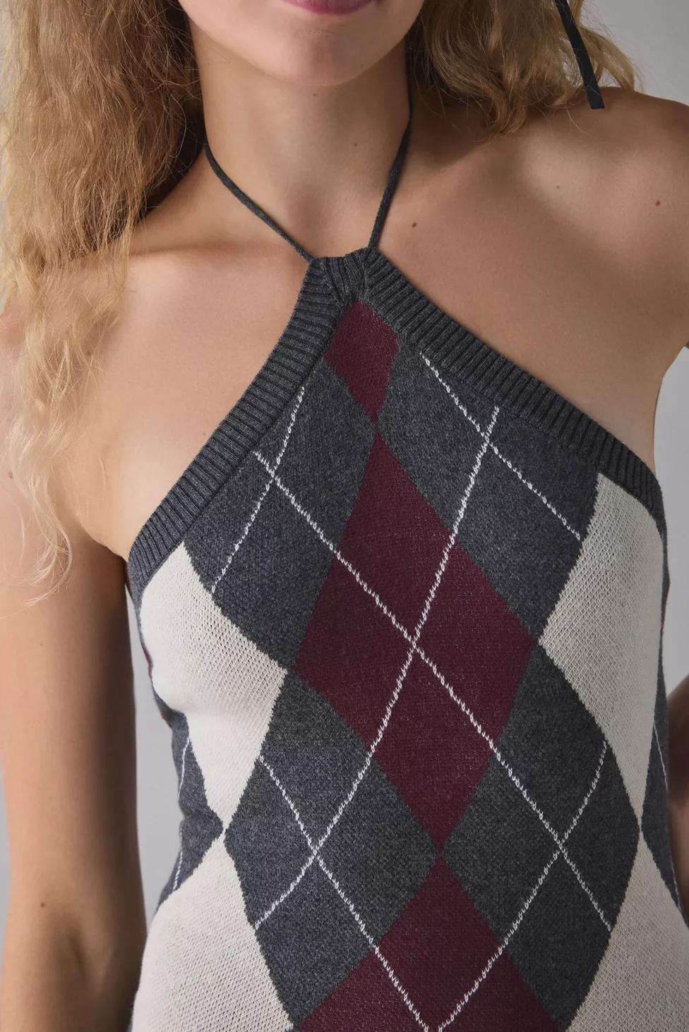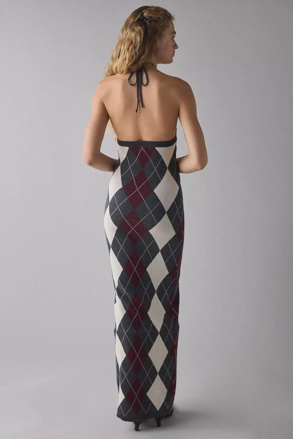 Glamorous maxi dress designed in a classic preppy argyle print knit. Designed in a slim, curve-hugging silhouette featuring a high halter neckline, cutaway shoulders and maxi length.