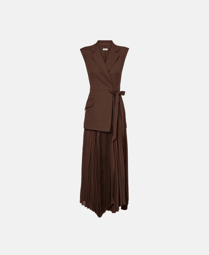 The Helena blazer dress by Simkhai combines sharp tailoring with handcrafted detailing. Featuring structured shoulders, notch lapels, flap pockets, and a pleated midi skirt, this piece is finished with a ribbon accent for a charming touch.