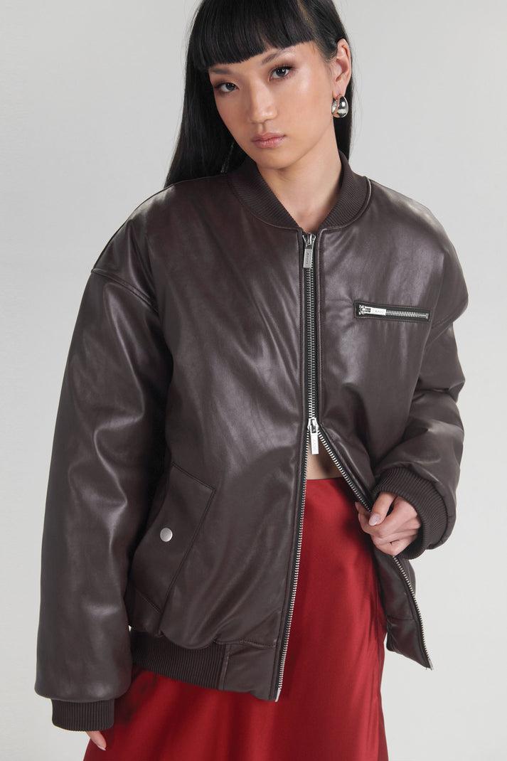 The Dylan Bomber Jacket is the ultimate cool girl closet staple. The quilted custom monogram lining brings a whole new layer to a clasic bomber jacket, turning it into a seasonless piece, perfect for both a chilly summer night and a winter layering dream. The double zip in the front gives it unlimitied styling options, while the zip breast pocket keeps it practicle. The ribbed knit cuffs and collar bring the bomber back to it's classic roots while the deep brown faux leather add a modern touch.
