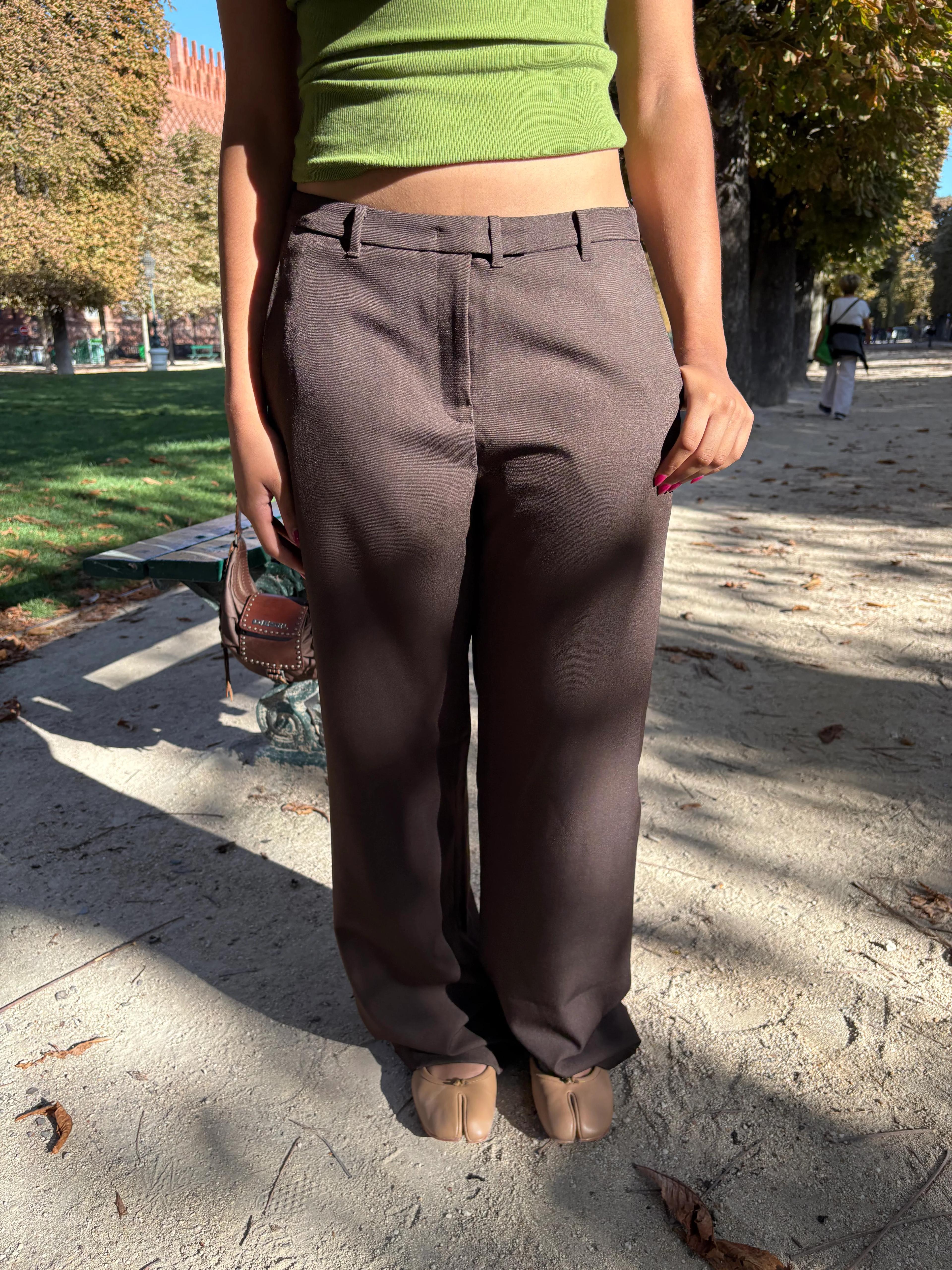 Introducing the Kennedy Trouser from Geel: a low-waisted, oversized fit designed with an easy straight leg. Featuring an overlay waistband closure, belt loops, and slanted side pockets, this chocolate brown trouser blends tailored detail with a relaxed silhouette. Finished with a subtle cuffed hem, it’s a versatile piece that moves effortlessly between polished and casual styling. Details 95% Polyester, 5% SpandexHand Wash Cold, Line DryImportedModel wears a size S and L Size Waist Rise Inseam XS 29" 10.25" 31.25" S 31" 10.5" 31.5" M 33" 10.75" 31.75" L 35" 11" 32" XL 37" 11.25" 32.25"