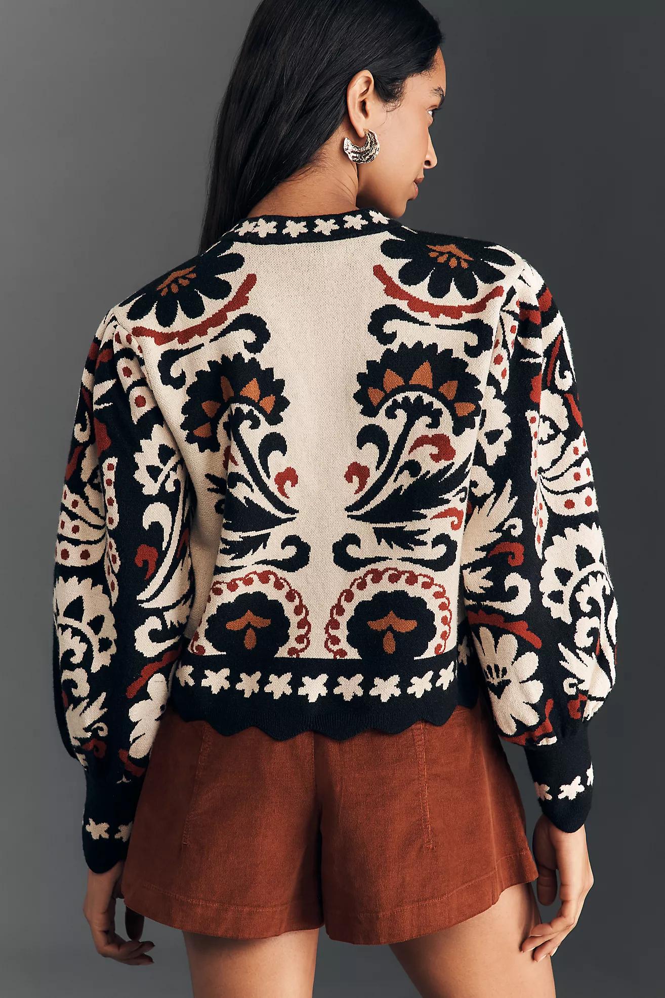 30% polyester, 24% viscose, 24% polyamide, 22% acrylic Intarsia tapestry-inspired knit Blouson sleeves with puff shoulders Crew neck Scalloped cuffs and hem Pullover styling