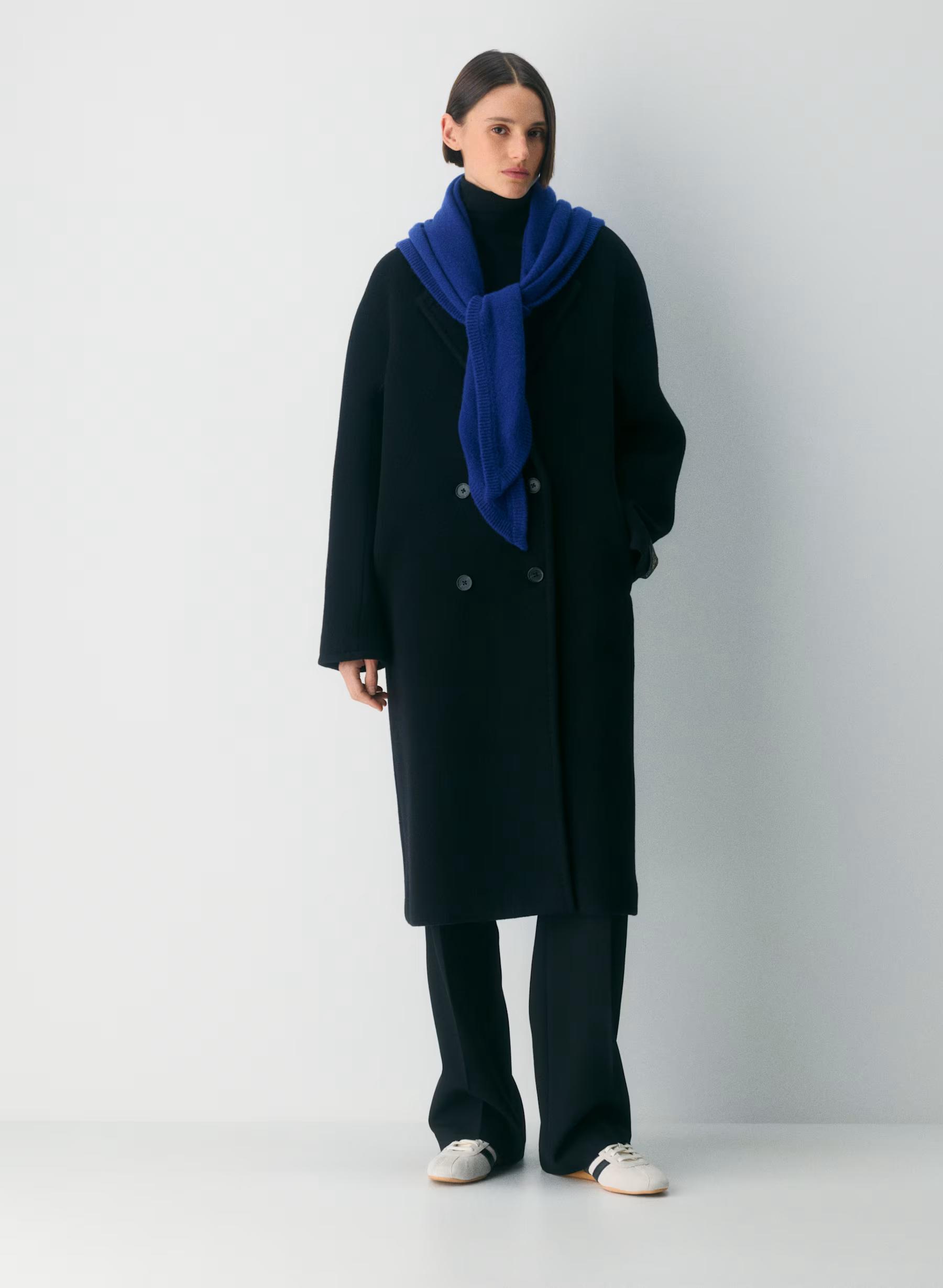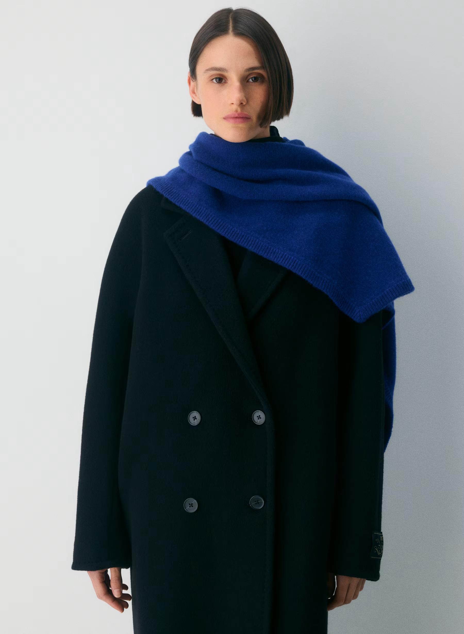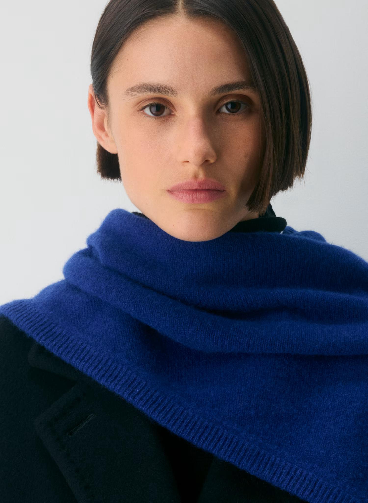 This is a triangle scarf with ribbed edges. It's knit with Aritzia’s Cashmere — 100% cashmere yarn coveted for its signature softness and warmth. The finest available. This cashmere is verified to The Good Cashmere Standard®. It's constructed with a Jersey stitch for a soft drape and a smooth, flat feel.