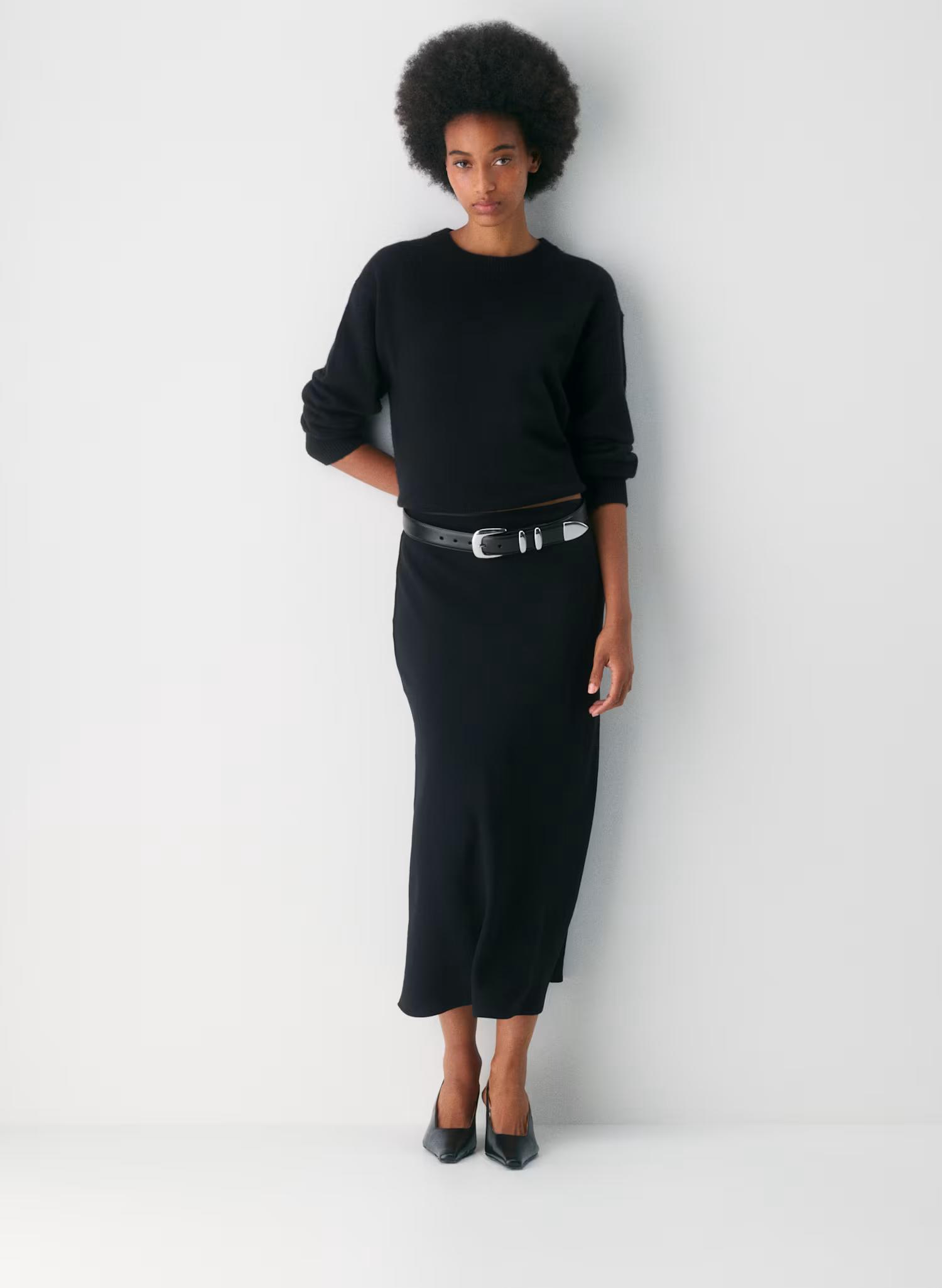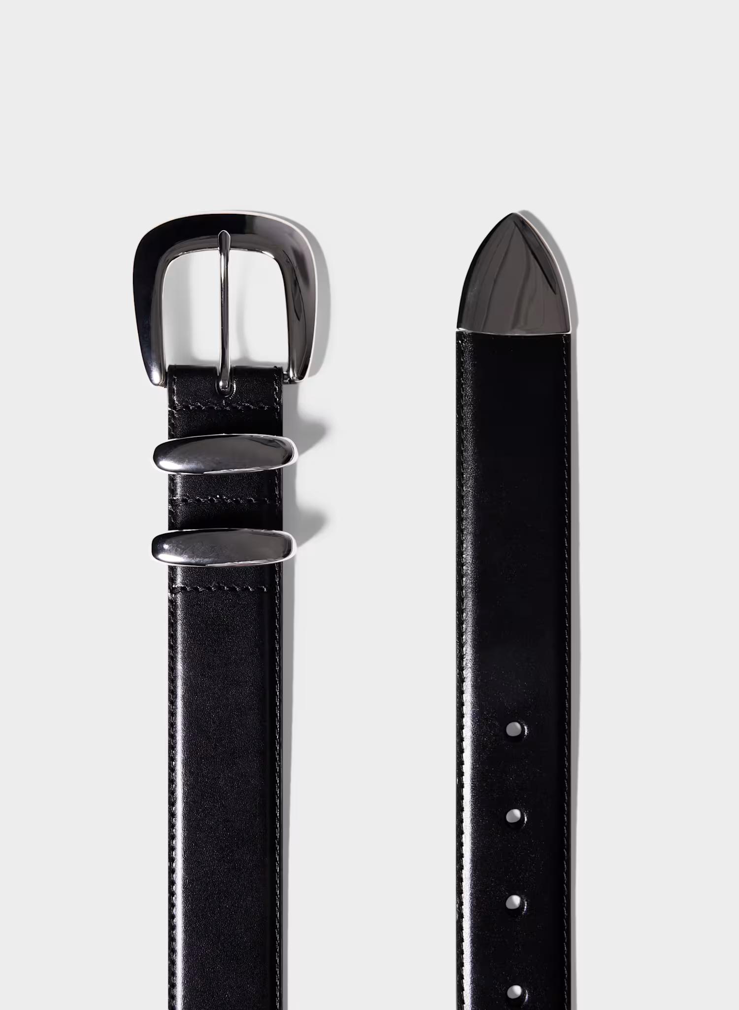 This is a wide western-inspired belt with hand-painted edges, a bombe surface for a rounded look and a solid brass buckle, keeper and tip end. It’s cut from Smooth Leather — 100% leather with a clean, smooth finish.