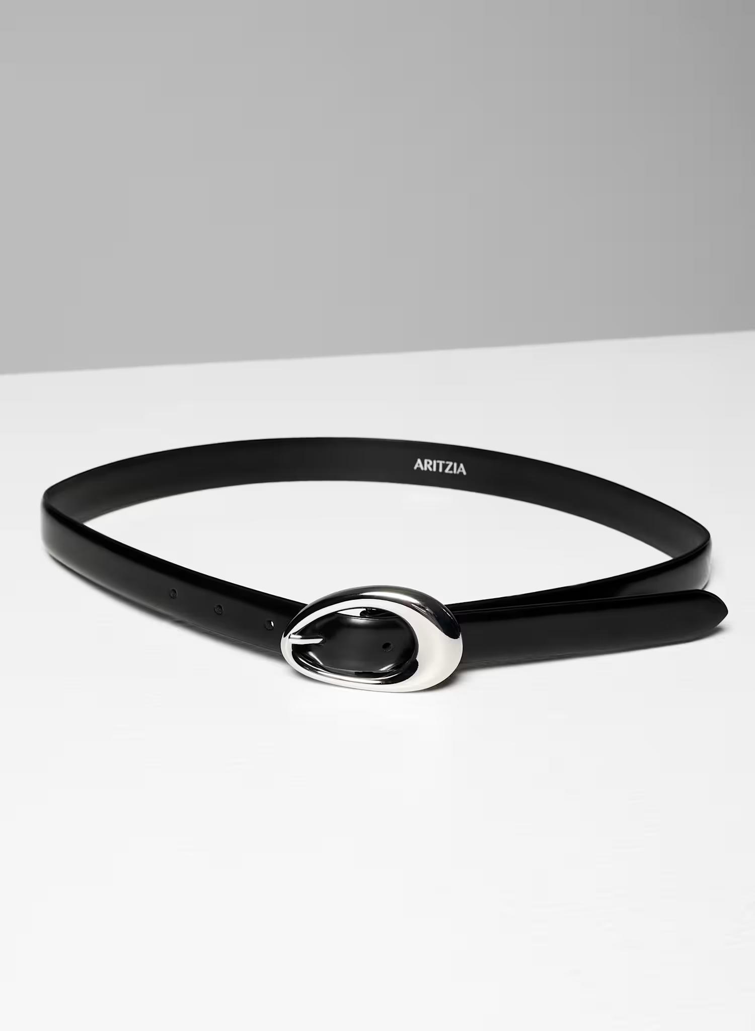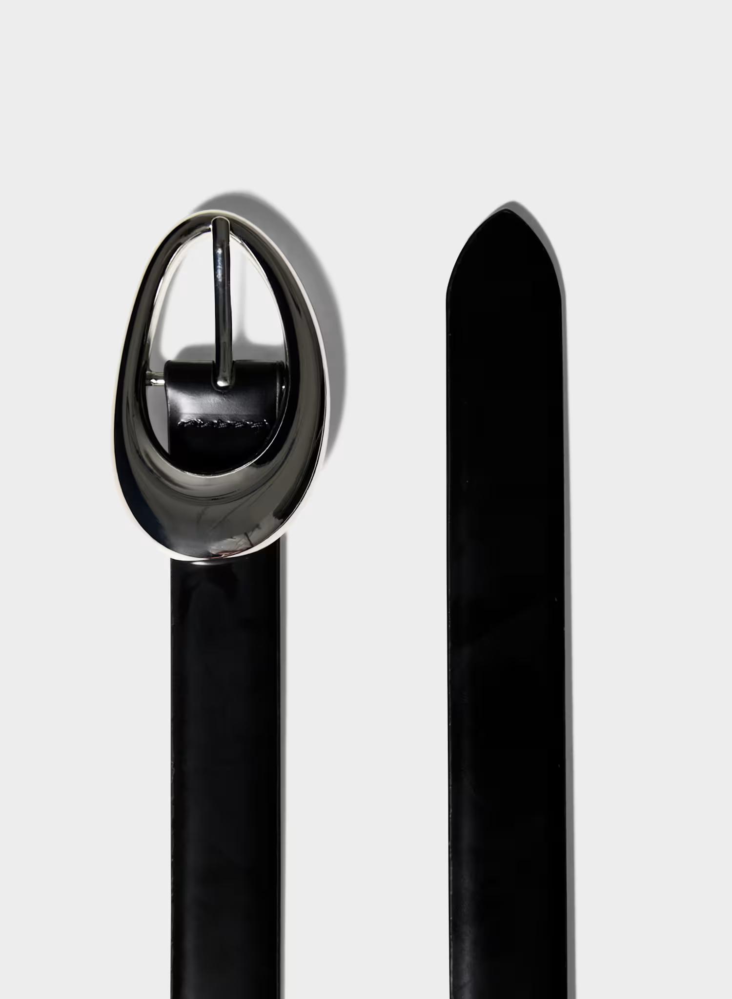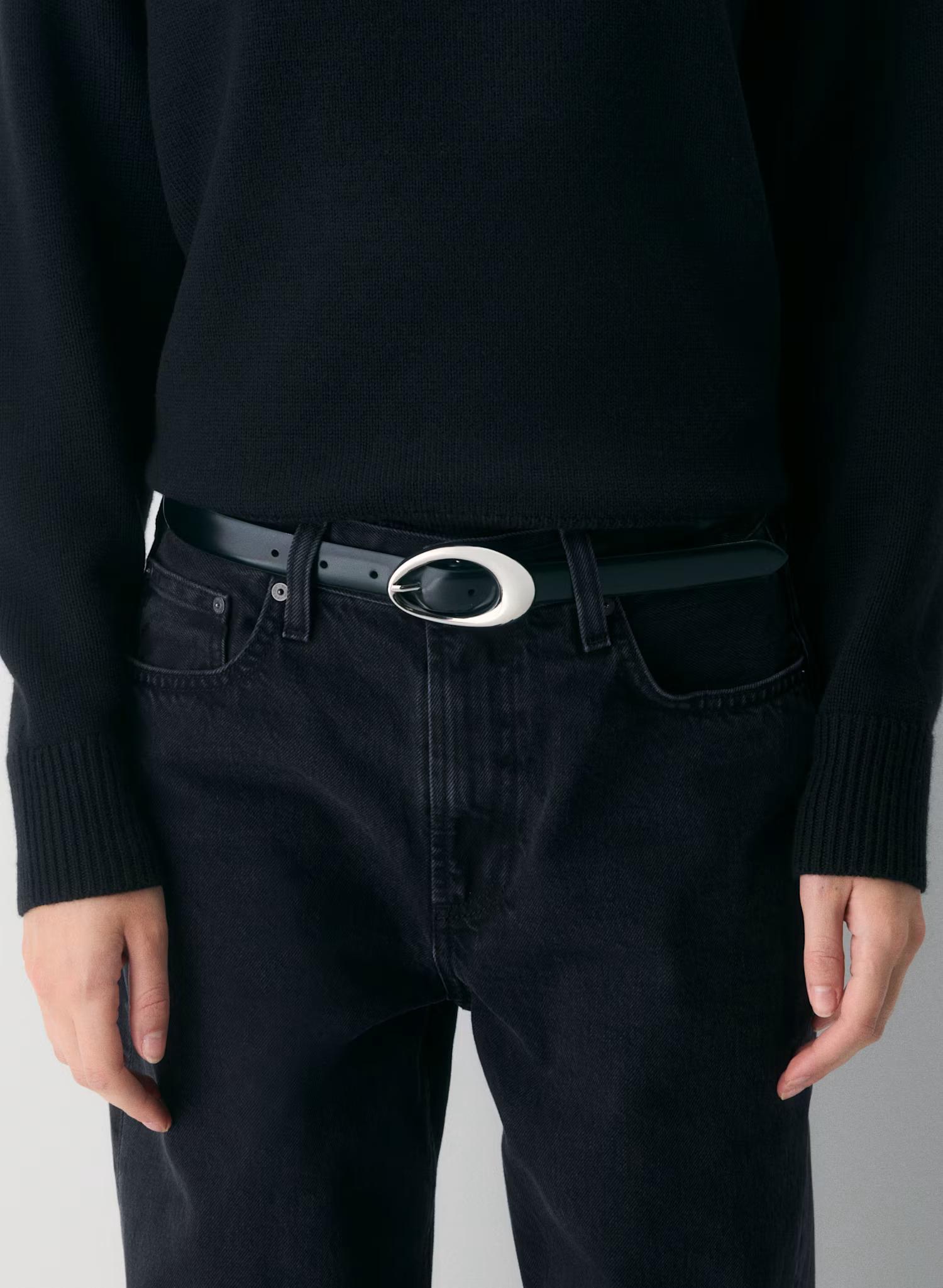 This is a belt with a solid brass oblong buckle, hand-painted edges and a flat surface for a sleek look. It’s cut from Veau Leather — 100% box calf leather with a glossy sheen and a luxuriously smooth feel.