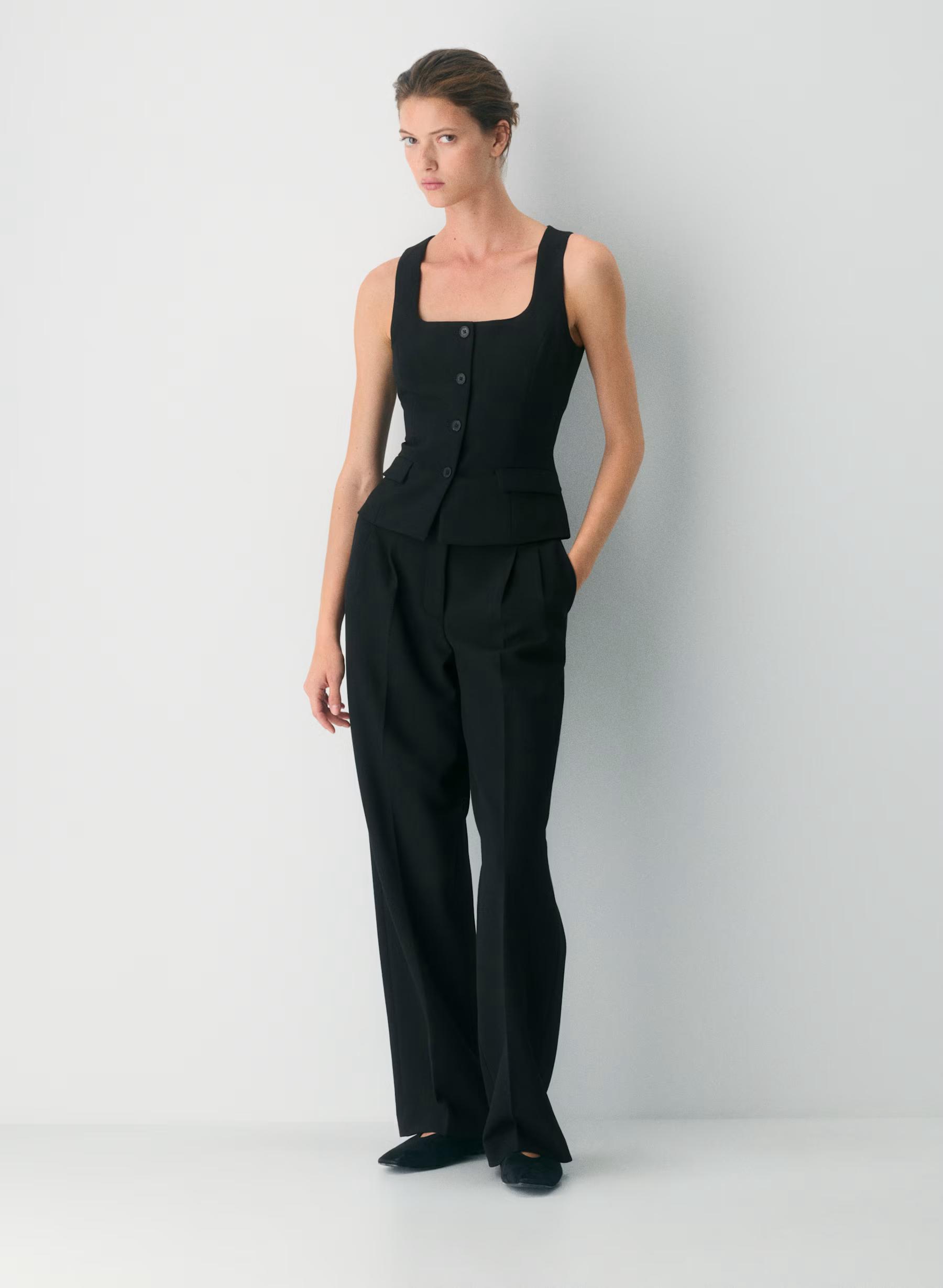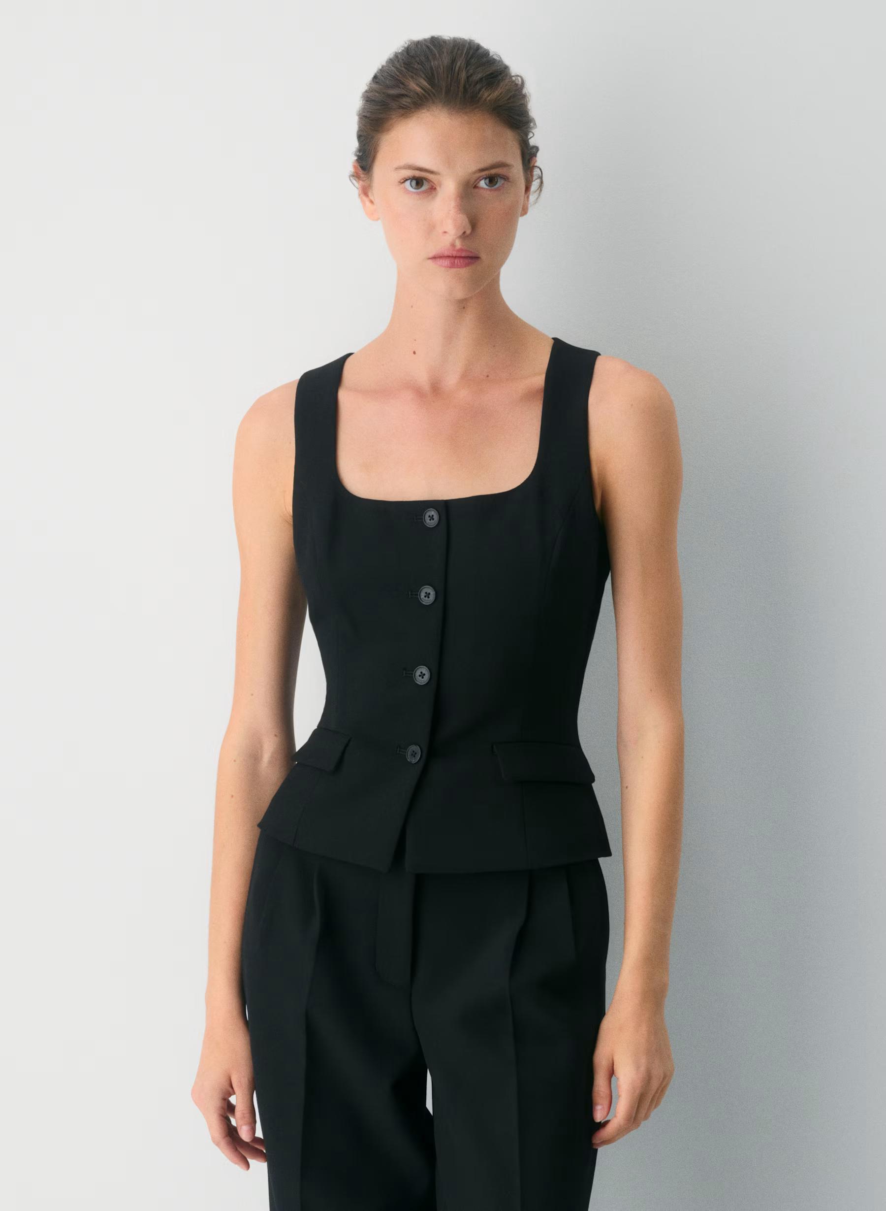 This is a fully lined vest with a square neckline, princess seams for shaping and a slim fit. It's expertly tailored with (Re)ssential — softly structured stretch fabric that holds its form while you move easy. This fabric is sourced from a premier Portuguese mill and made with 54% recycled polyester and 26% LENZING™ ECOVERO™ Viscose.