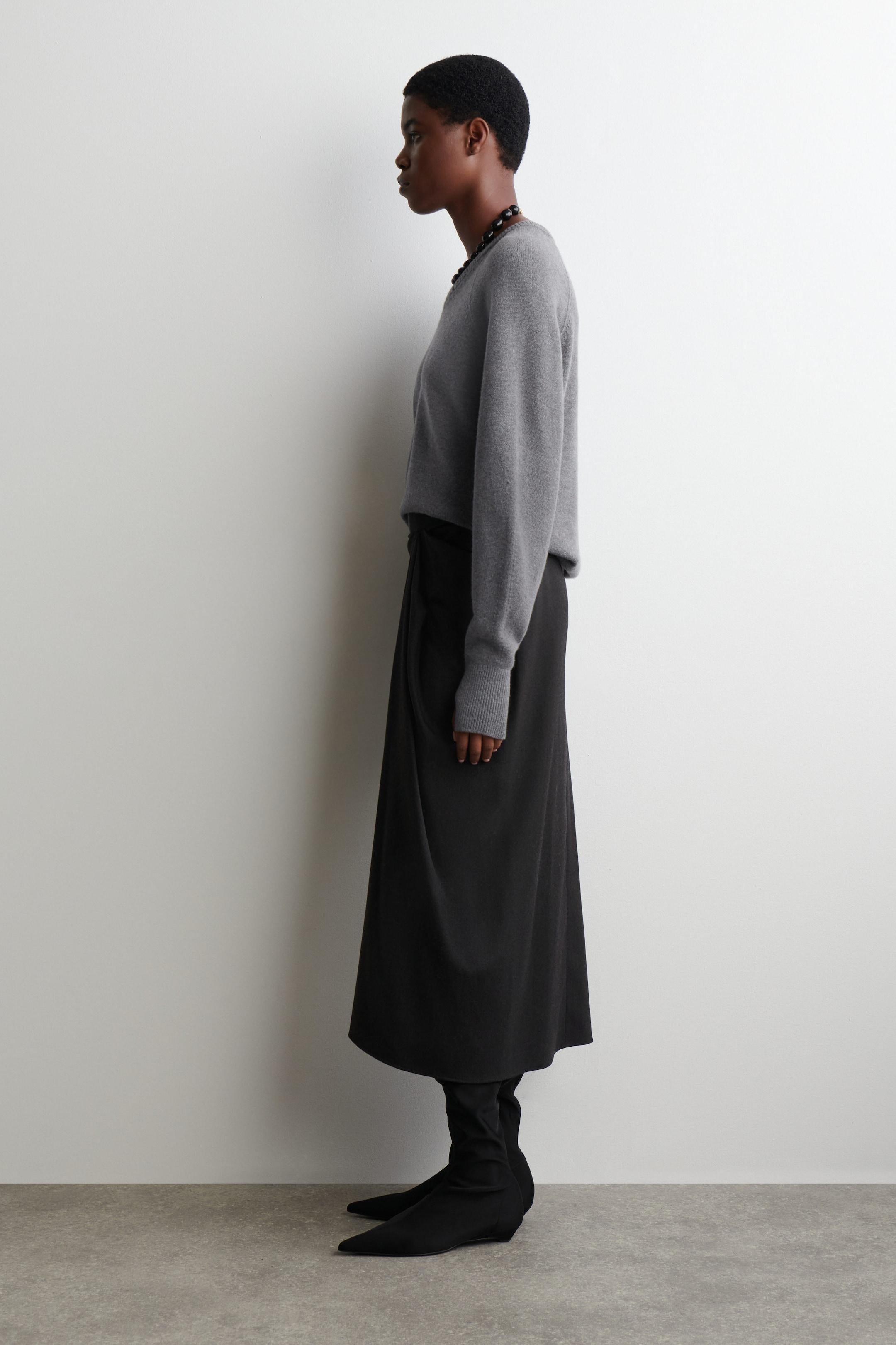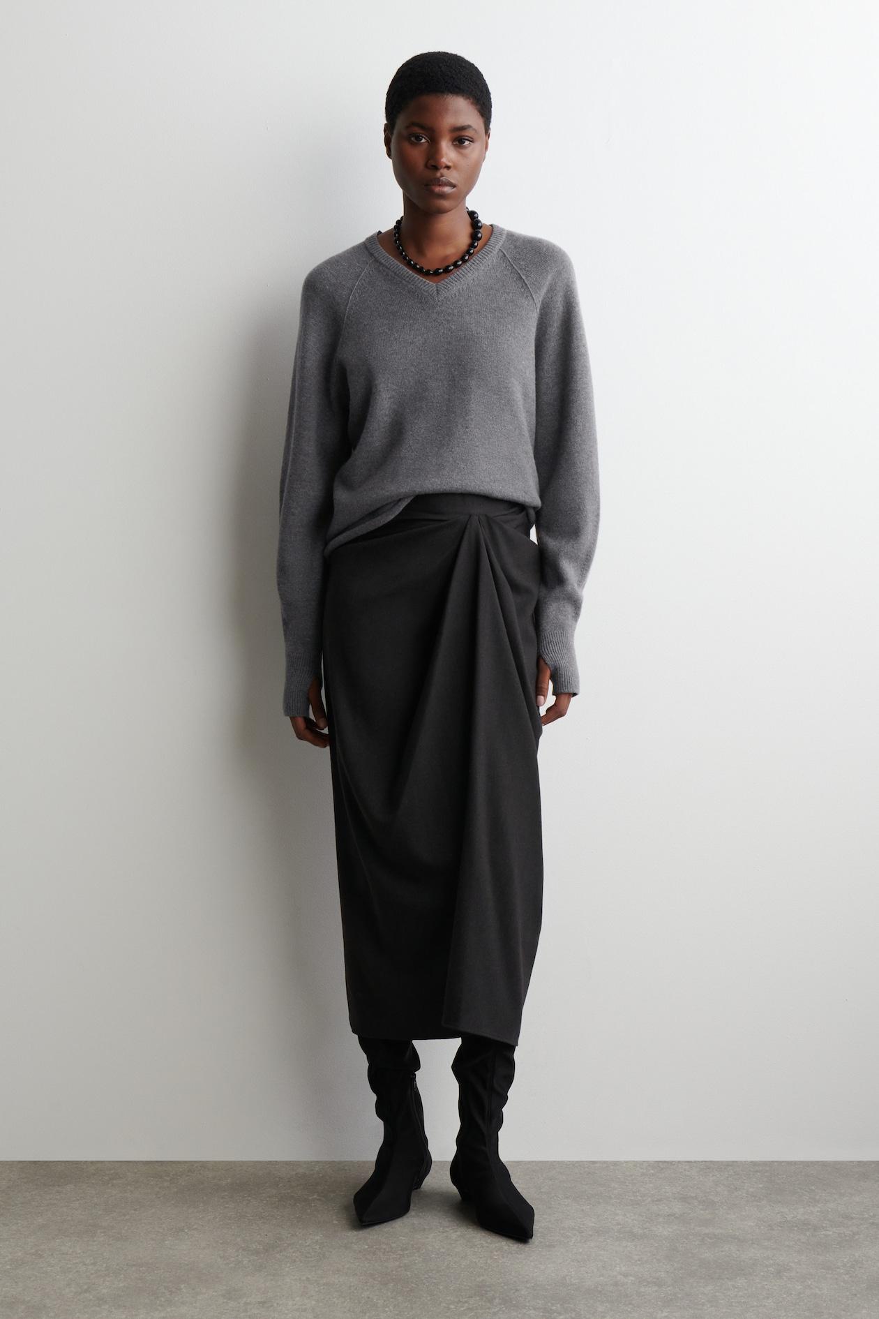 This season's womenswear collection is underscored by sumptuous fabrics and sofly draped silhouettes. Rendered in a deep charcoal tone, this modern skirt is crafted from an RWS wool blend and has an artfully gathered detail at the waist and a subtly asymmetric hem.