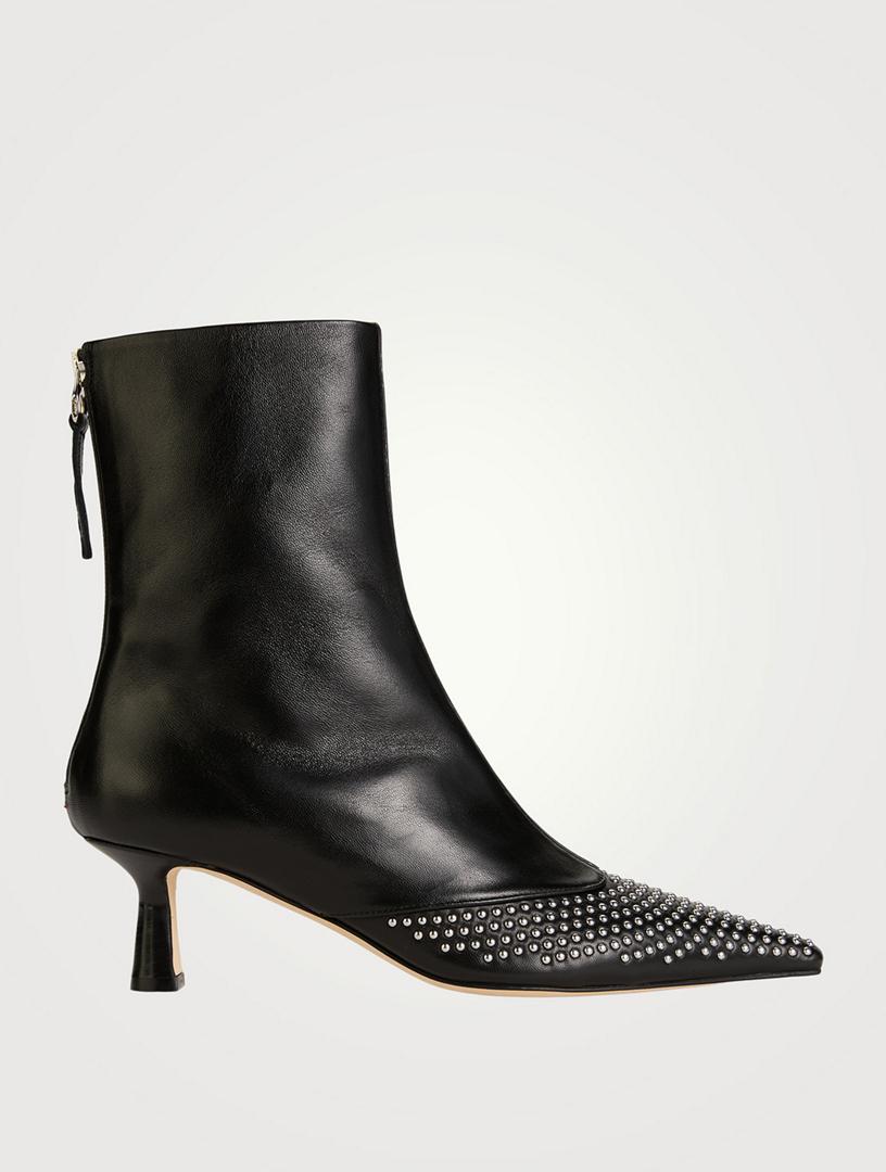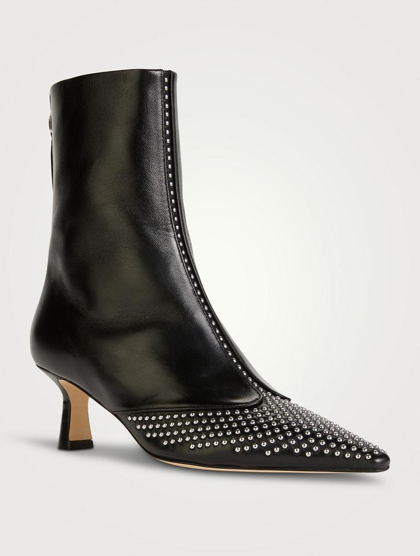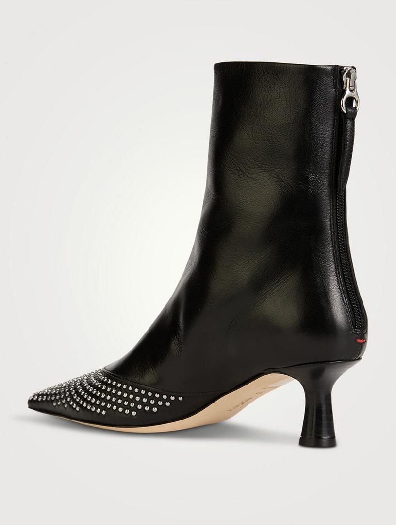 Sila is the pointed-toe ankle boot defined by a beaded T-Bar detail, lifted by a slim kitten heel, and finished with layered details that nod to trompe l'oeil techniques. Aeyde footwear is made in Italy with generations of leather-specialist knowledge in family-run factories.