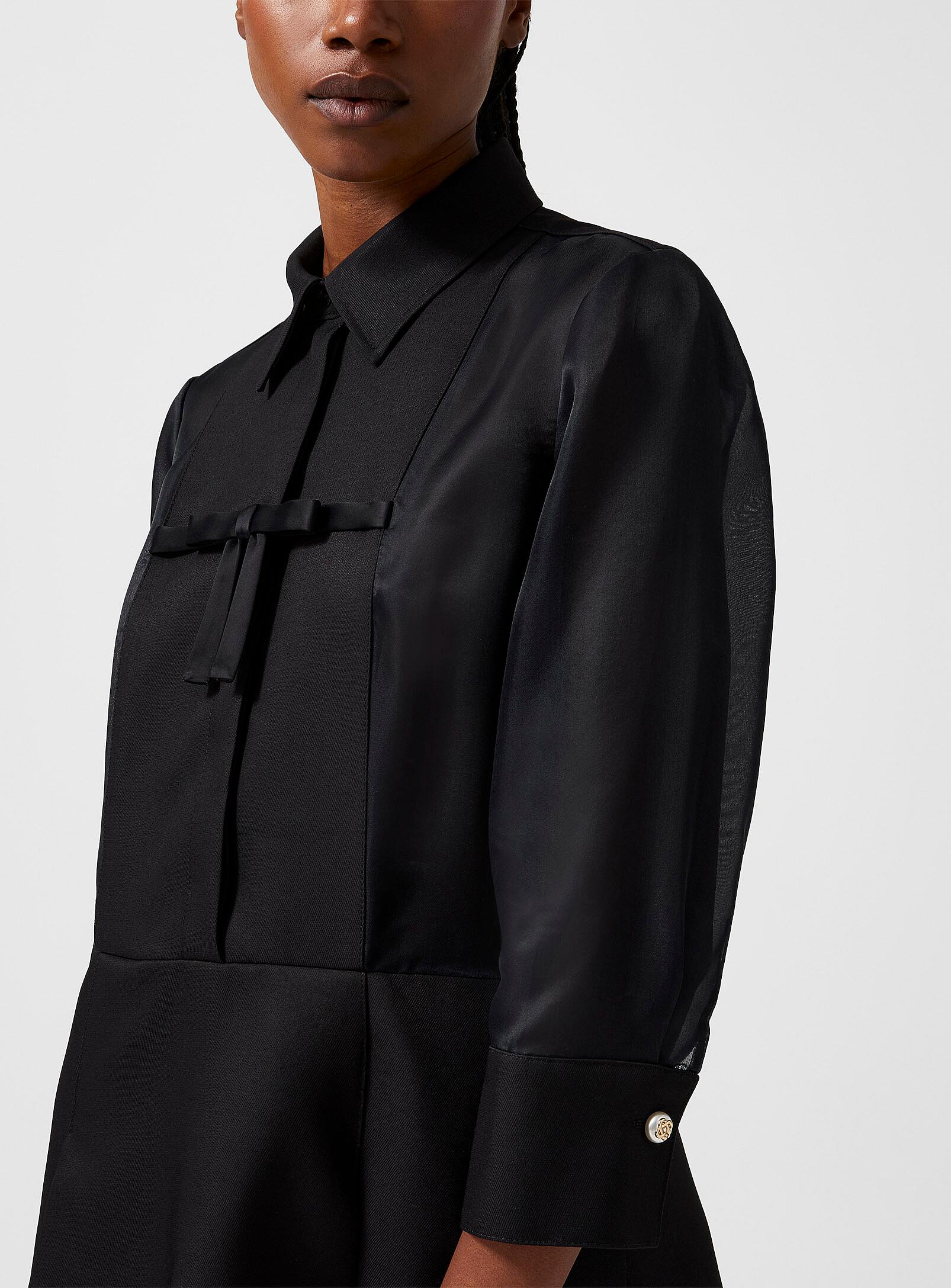 This dress showcases a bold silhouette adorned with classic details, underscored by deep black silk crepe with contrasting sheerness at the sleeves, along with a point collar and an adorable bow at the chest, creating a piece emanating luxurious nostalgia distilling Casablanca's aesthetics.