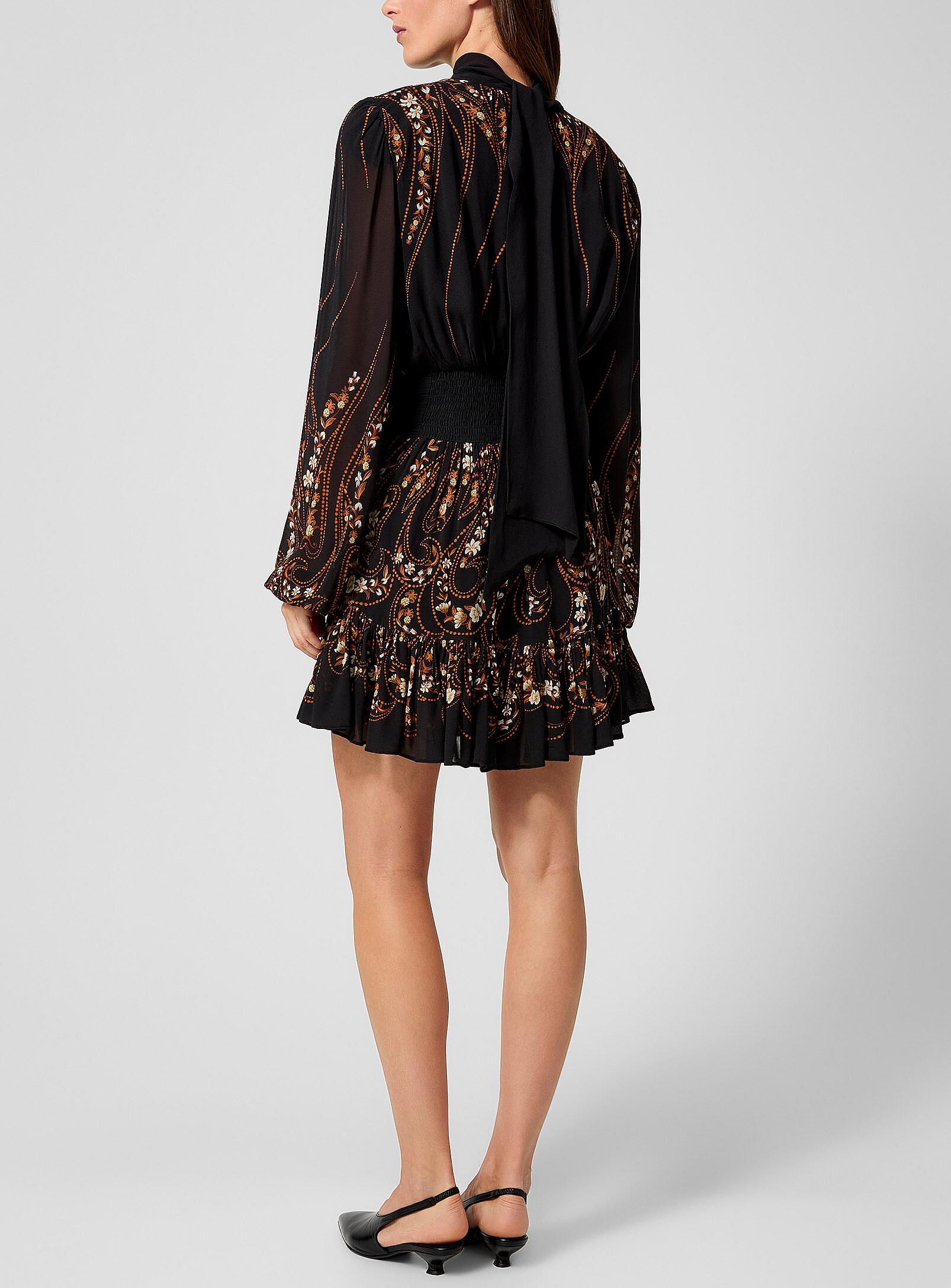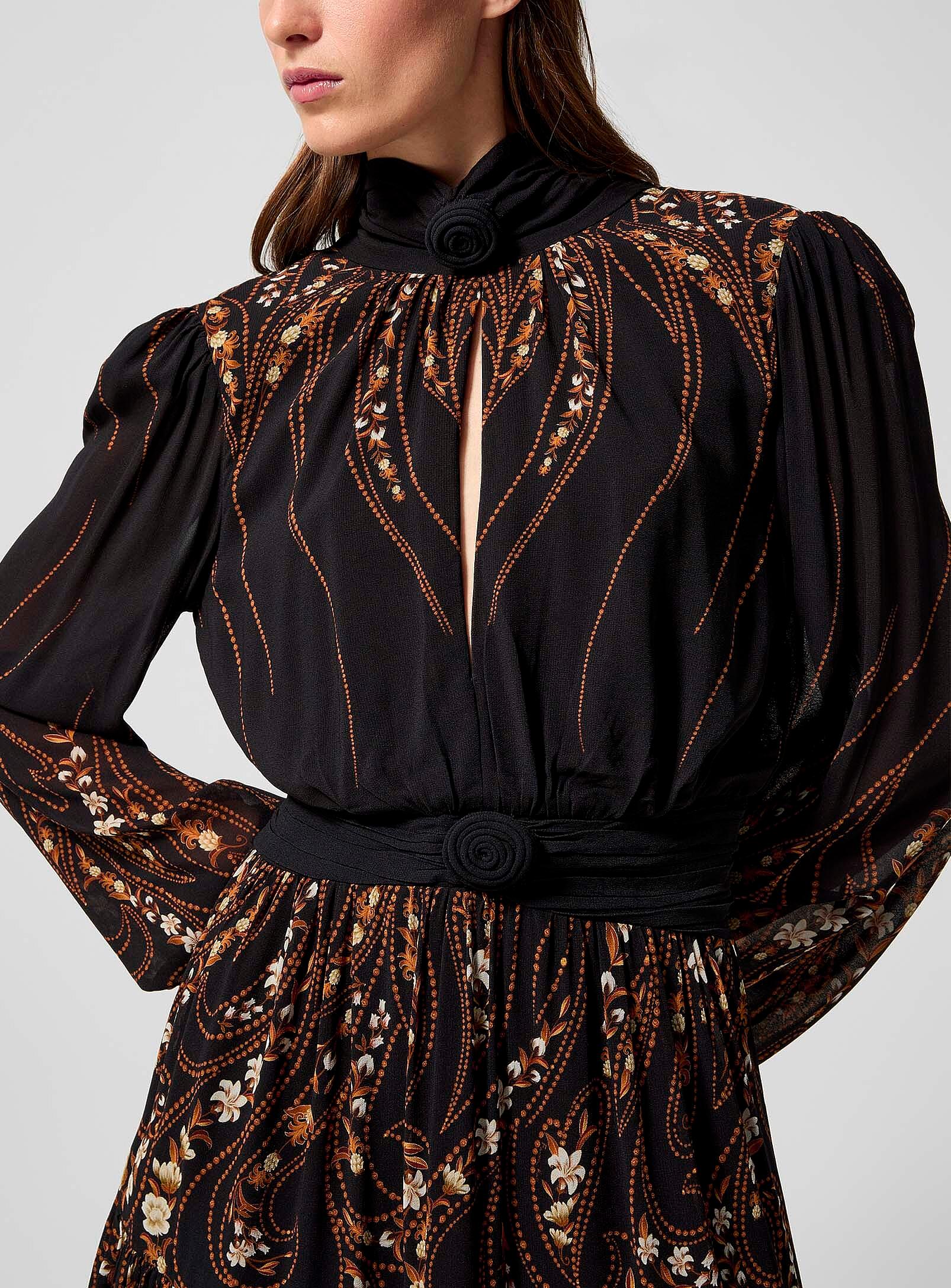 The crepe is fluid and gathered at the skirt and bust of this dress in warm brown hues with a stylized garden spread across the material, echoing the gorgeous embossed flowers at the waist and collar.