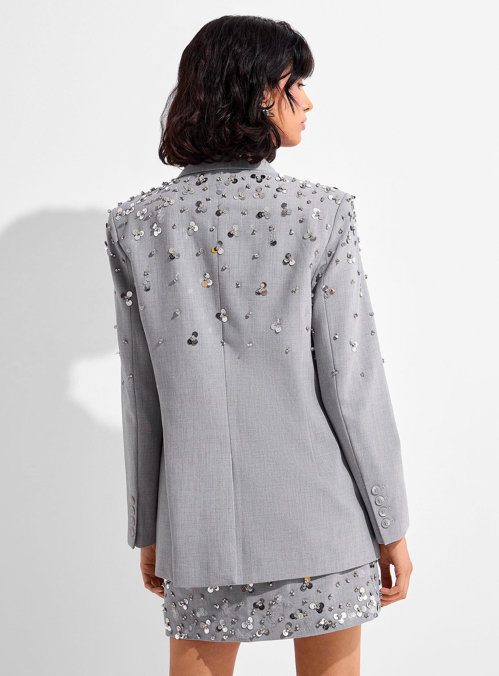 Lightweight and structured fabric in a polyester and viscose blend Fine silky lining Slightly loose fit Notch collar Built-in shoulder pads Piped flap pockets Double-breasted crossover closure Centre vent behind