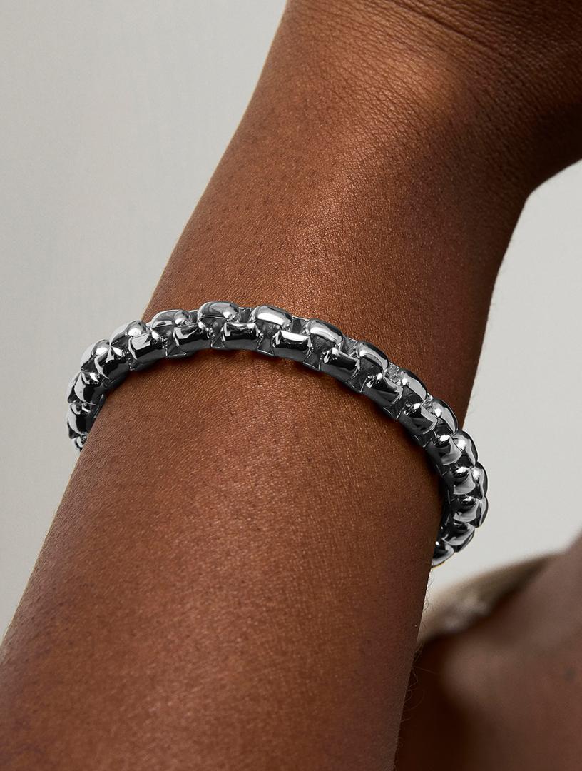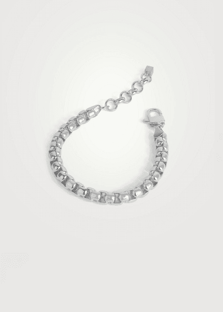 Wrap your wrist with a bigger, bolder take on the signature softbox chain, featuring cube-shaped links and an adjustable length. Crafted in Dean Davidson Signature high-polish rhodium plating over high-quality brass.