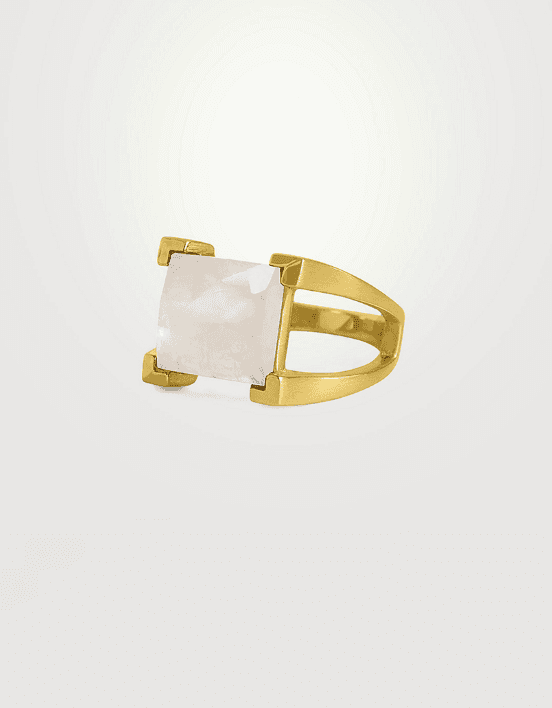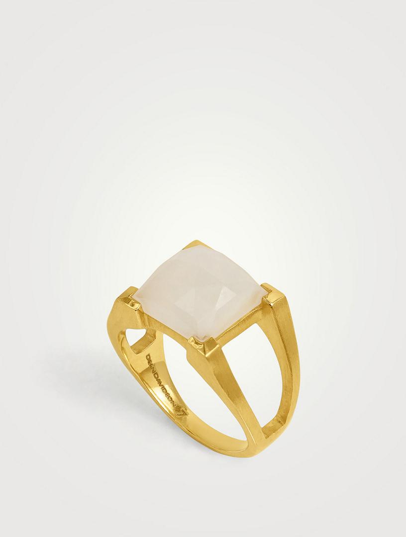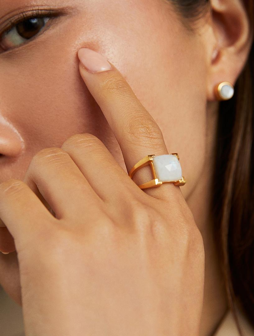 Reinvented for everyday wear, the Mini Plaza Ring features a smaller, stackable design with a hand-cut Rainbow Moonstone, offering effortless elegance and versatility. Crafted in Dean Davidson Signature brushed gold plating over high-quality brass with semi-precious stone.